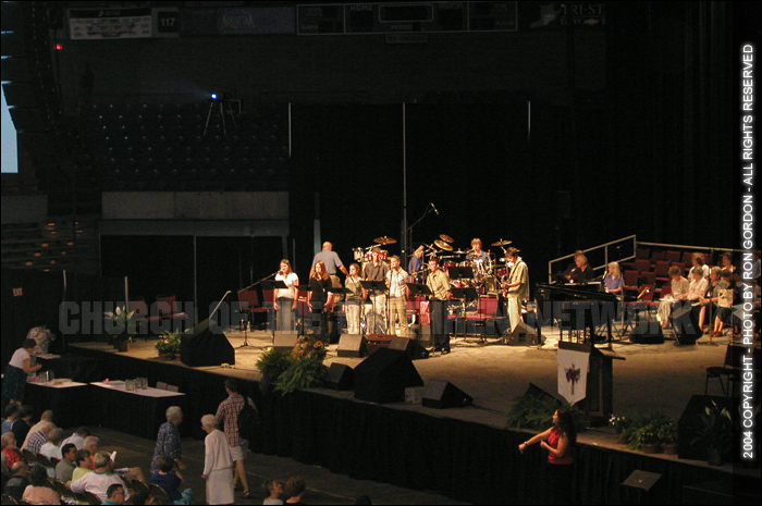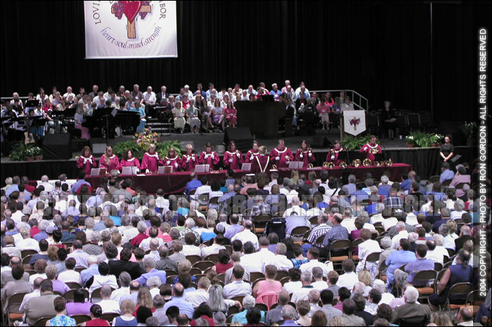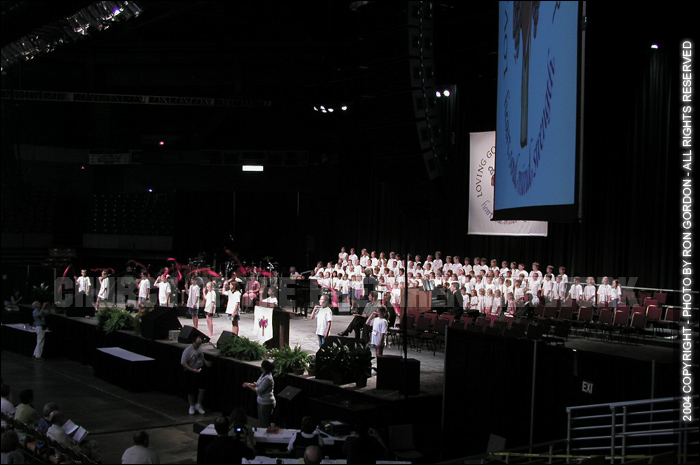 The Coliseum gave Worshippers plenty of room. The uppermost blue section was originally roped off but the volume of attendees eventually forced convention officials to open it, and it remained open throughout the week. Talented Musicians enhanced the spiritual atmosphere of each service. A Brass Ensemble performed for the Saturday evening worship service, and also for passersby in the convention lobby, a wide area that depicted many Historical Items of Charlestown. On Sunday morning, worshippers were blessed to hear the Palmyra Canticle Bell Choir. Tuesday evening worship is the treasured moment to hear the Children's Choir, this year one song involved Coordinated Movement. New for this year was a special fragrance free section located at the front-right of the convention hall to accommodate persons suffering from allergies or similar health related issues. Live Updating of business on the projection screens, allowing delegates to more clearly visualize how proposed amendments from the floor would affect the reading of the original draft. This is a welcome improvement