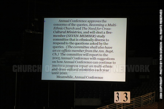 When the names of the study committee were announced it was embarrassingly noticed that no African-Americans had been elected, the very type of subtle discrimination which previous business discussion had identified and sought to reverse. Business was reopened and delegates passed a motion that required the study committee to add an eighth member from the original African-American nominees.
