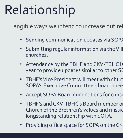 Church of the Brethren’s values and mission, as well as TBHF’s and CKV-TBHC’s
